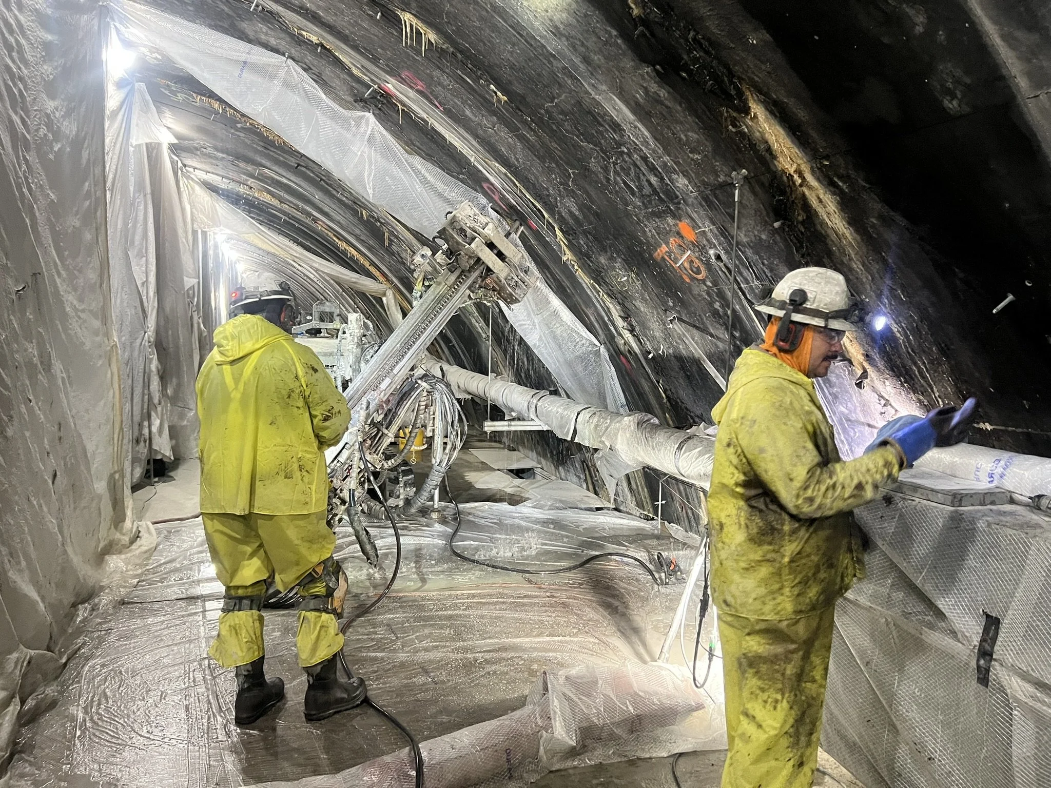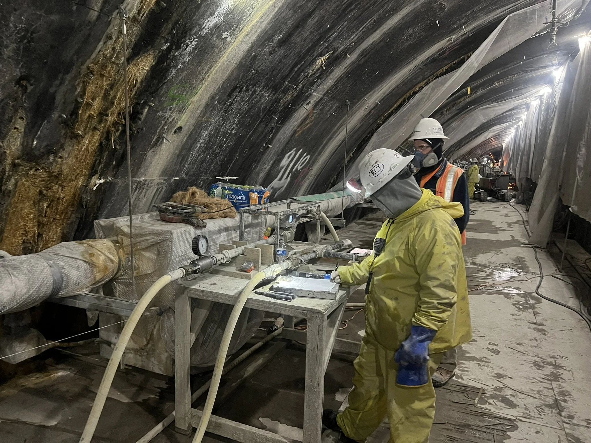 Once the platform was in place, crews began drilling hundreds of three-stage grout holes throughout webound tunnel. Using an ultrafine cement and neat cement grout, injected at pressures up to 440 PSI, the team is filling voids behind the structural tunnel liner and stabilizing rock fractures extending as far as 20 feet outside of the tunnel. These grouting operations are critical to maintaining the long-term durability of the liner and roadway.