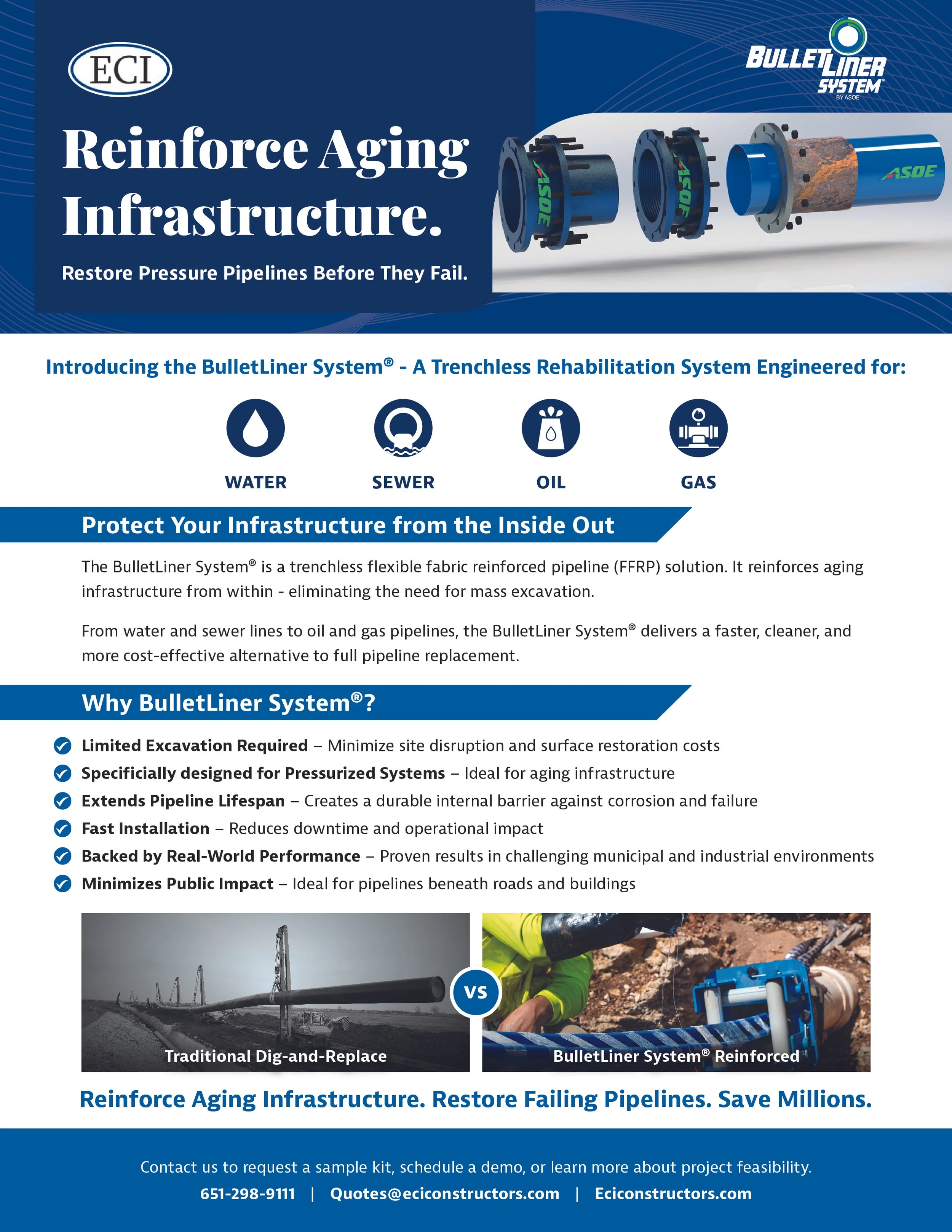 The BulletLiner System® is a trenchless flexible fabric reinforced pipeline (FFRP) solution. It reinforces aging infrastructure from within - eliminating the need for mass excavation.